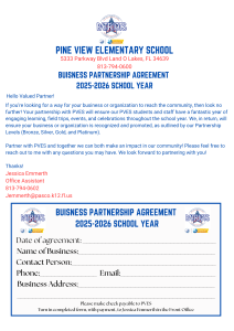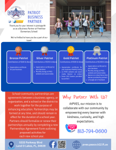 If you’re looking for a way for your business or organization to reach the community, then look no further! Your partnership with PVES will ensure our Patriot students and staff have a fantastic year of engaging learning, field trips, events, and celebrations throughout the school year. We, in return, will ensure your business or organization is recognized and promoted, as outlined by our Partnership Levels (Bronze, Silver, Gold, and Platinum). A downloadable and printable version of our agreement can be found below. If you have any questions, please feel free to email Jessica Emmerth at Jemmerth@pasco.k12.fl.us.